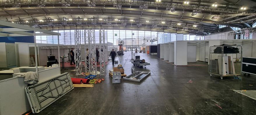 Alle Pläne sind gemacht. Jetzt geht es an die Umsetzung. Jeder weiß, wo er anpacken muss. Der Teppich liegt, die Wände stehen, Strom ist da. Ab jetzt braucht es jede helfende Hand. Die Verlags-Karree-Mitglieder bauen ihre Stände auf. Traversen werden gestellt: Die Bühne entsteht! Ab Mittwoch 20.10. ist hier das Podium Rheinland-Pfalz auf der Frankfurter Buchmesse 2021. Seid ab Mittwoch bei fast 50 Veranstaltungen live dabei bei unseren YouTube-Livestreams.
